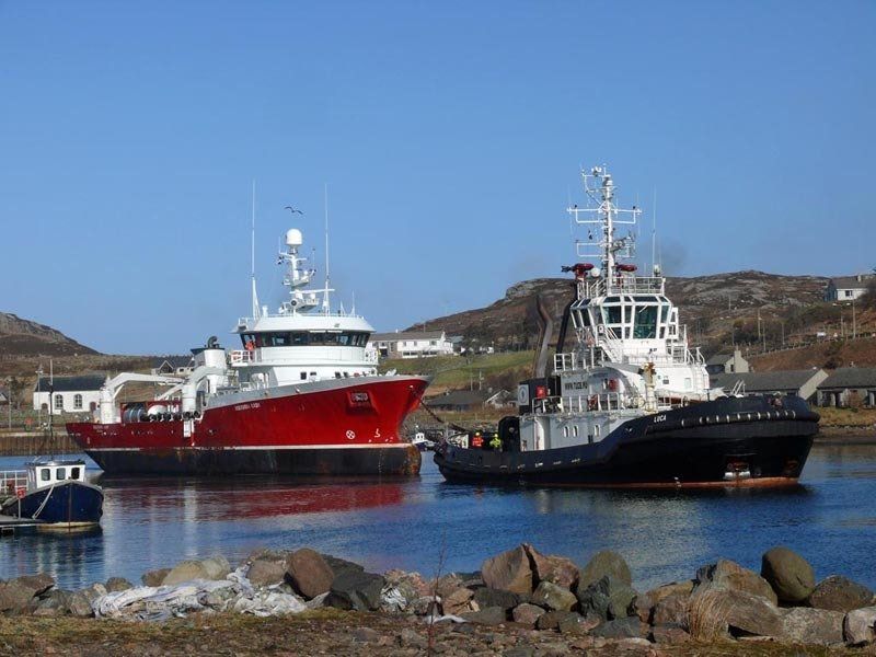 Viktoria Lady being towed out of Kinlochbervie harbour by tug Luca, en route to Norway for repairs.