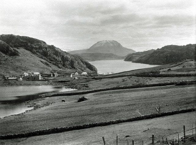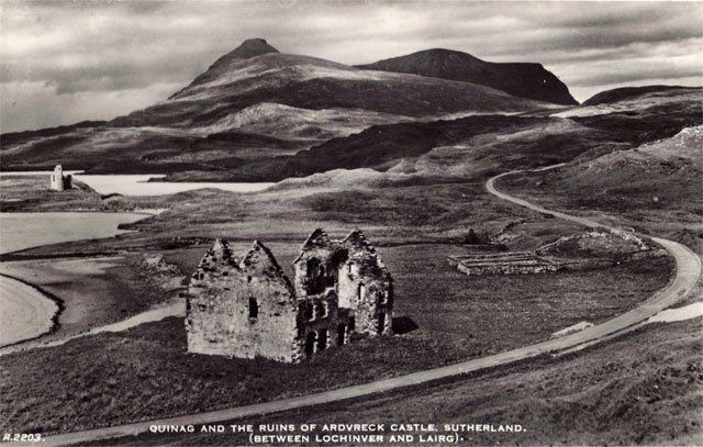 Quinag and the ruins of Ardvreck Castle, during the 1950s.